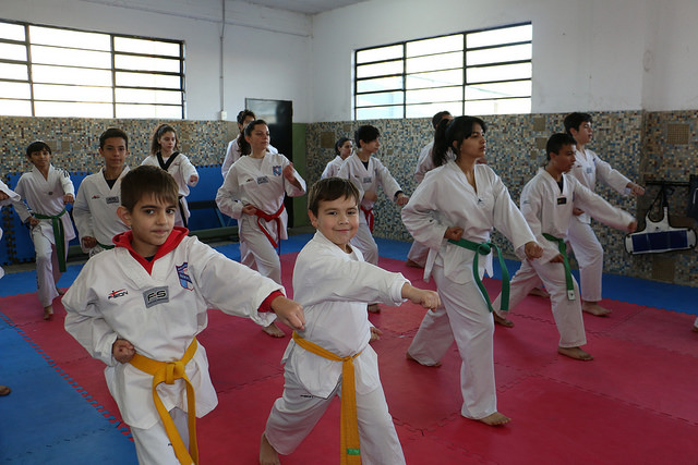 Los niños y jóvenes vestidos con sus kimonos blancos dispuestos a comenzar la clase se ubican en filas de acuerdo a su estatura. Enfrente a ellos, el maestro indica los movimientos y arranca la acción: en forma coordinada realizan una especie de coreografía llena de patadas, saltos, golpes al aire, que se repite una y otra vez. En el amplio salón donde se dictan las clases de Taekwondo (en el Campo Municipal N° 5) se respira un profundo clima de concentración, integración y respeto.