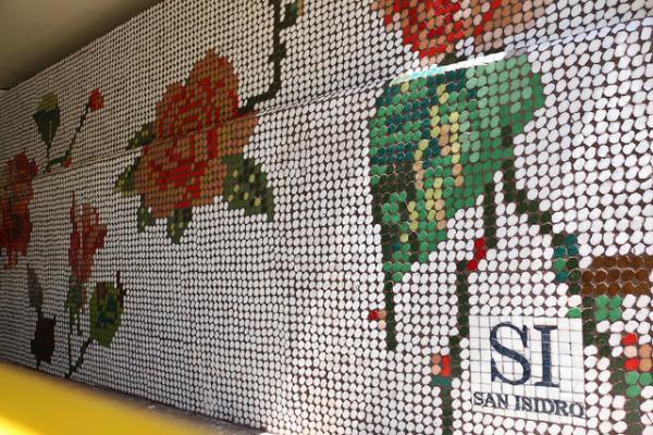 La obra, de 40 metros cuadrados, está constituida por trozos de mosaico veneciano que forman rosas amarillas y rojas sobre un fondo celeste y blanco.