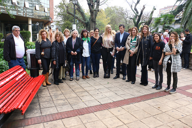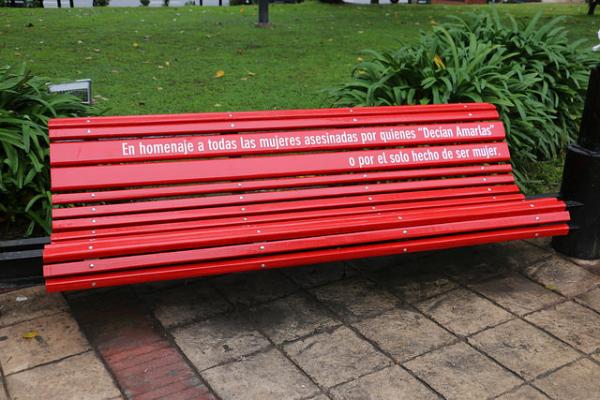 “En homenaje a todas las mujeres asesinadas por quienes DECÍAN AMARLAS o por el solo hecho de ser mujer”, se lee en el respaldo de un banco rojo en la Plaza Hipólito Yrigoyen de San Isidro. Se trata de una campaña internacional contra la violencia de género a la que se sumó el municipio, colocando un banco en esta plaza del centro de San Isidro.