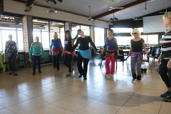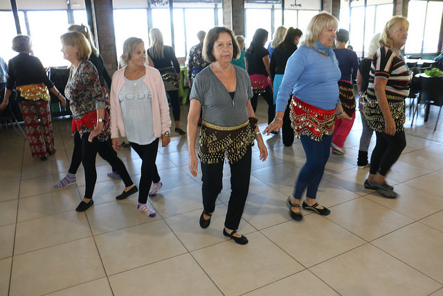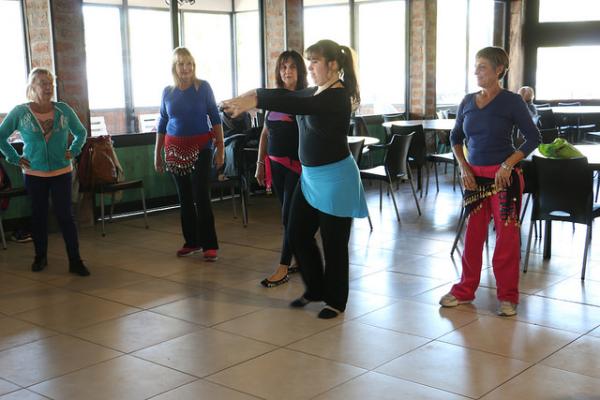 Ubicadas en círculo, las alumnas se disponen a comenzar su rutina de baile. Comienza la música y mueven su velo y su cuerpo con una agilidad sorprendente. Mientras la profesora observa atentamente y da las indicaciones: “Brazos en v, uno de los pies se adelanta y se cruza por delante”. Las abuelas acatan y coordinan los movimientos, y se notan a gusto ante cada postura.