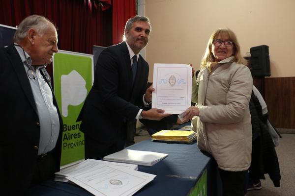 En la Sociedad de Fomento “9 de Julio” de Boulogne, unas 60 familias recibieron sus escrituras, título definitivo que las acredita como propietarias del terreno que habitan. Fue el resultado de un trabajo conjunto entre la Escribanía General de Gobierno de la Provincia de Buenos Aires, el Instituto de Vivienda y el Municipio de San Isidro.
