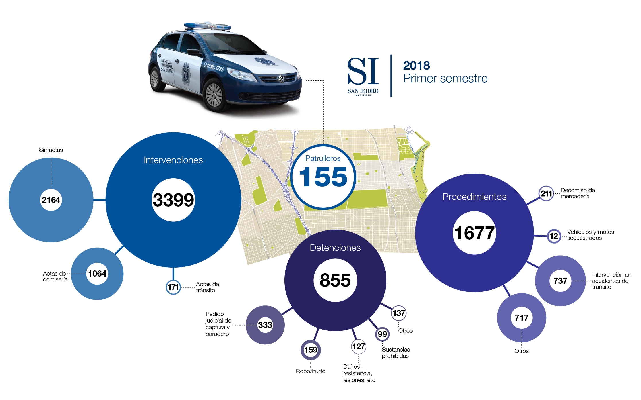 Durante el período de enero a junio de este año, los 155 móviles municipales que patrullan las 24 horas las calles de San Isidro permitieron la detención de 855 personas, lo que da un promedio de más de cuatro detenidos por día.