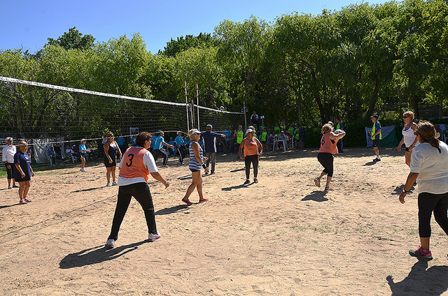 Al aire libre, en una cancha de arena, los adultos mayores se disponen a jugar al newcom, el voley adaptado que cada día suma más adeptos. Primero hacen una entrada en calor para preparar sus músculos, articulaciones y así prevenir lesiones. Se dividen en equipos de seis jugadores cada uno y escuchan atentamente cada una de las indicaciones del profesor. Finalmente, hablan entre ellos y se arengan, porque más allá del esparcimiento, demuestran su sentido de competencia para crecer.