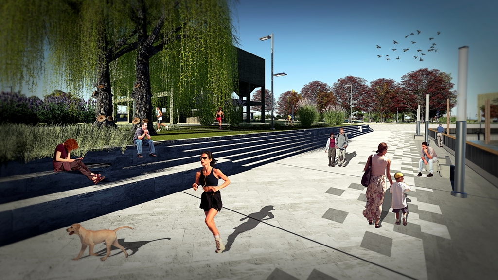 Como si fuera una línea imaginaria, la ciclovía y bicisenda dividen un sector verde y de descanso para contemplar el agua desde las escalinatas, y otro espacio más cercano a la ciudad donde se desarrollarán las actividades recreativas, deportivas y culturales.