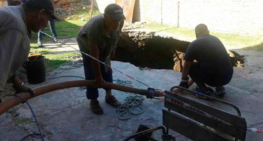 Los trabajos consisten en desagotar el pozo, del que ya se extrajeron unos 50 mil litros de agua, para luego rellenar, cimentar, compactar y hacer un piso nuevo para evitar así el peligro de desmoronamiento.