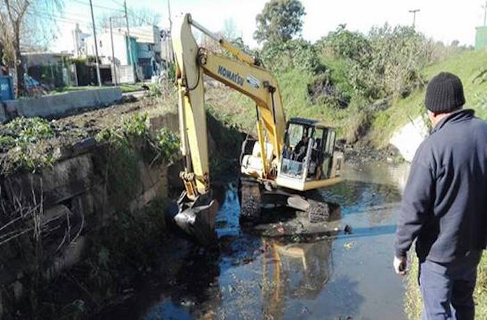 Con maquinaria y personal se realizó la limpieza, mantenimiento y rectificación del cuenco receptor de excedentes pluviales, en Sarratea y Cazón.