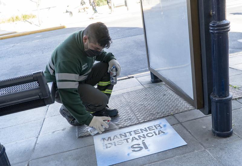 “Colocamos cartelería en distintos espacios públicos y pintamos huellas en paradas de colectivos, estaciones de tren, entre otros lugares donde se junta mucha gente, para que los vecinos sepan cual es la distancia correcta que hay que mantener para cuidarse”, detalló el subsecretario de Espacio Público, Leandro Martín.