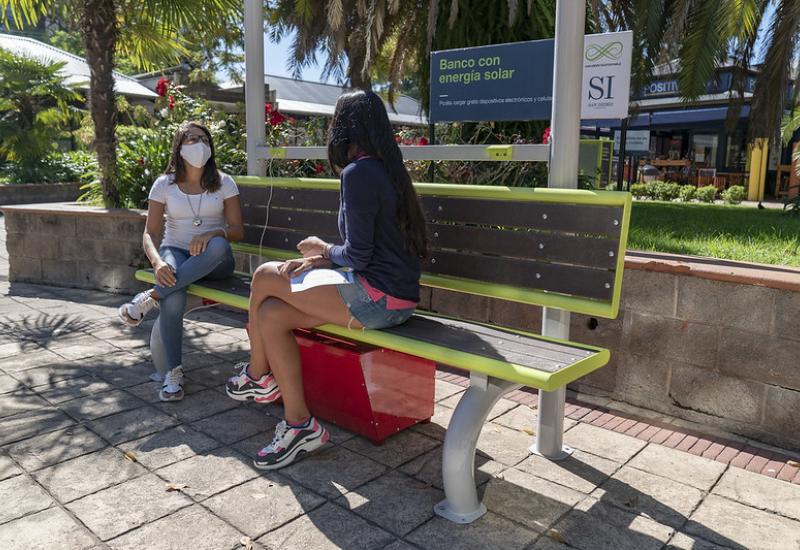 En una mañana de sol radiante Paula y Mariana aprovechan la energía del nuevo banco para cargar sus celulares y charlar. El banco tiene dos paneles que captan la energía del sol y brinda la posibilidad a la gente de cargar sus celulares e incluso trabajar desde allí; ya que la plaza cuenta con Wifi.